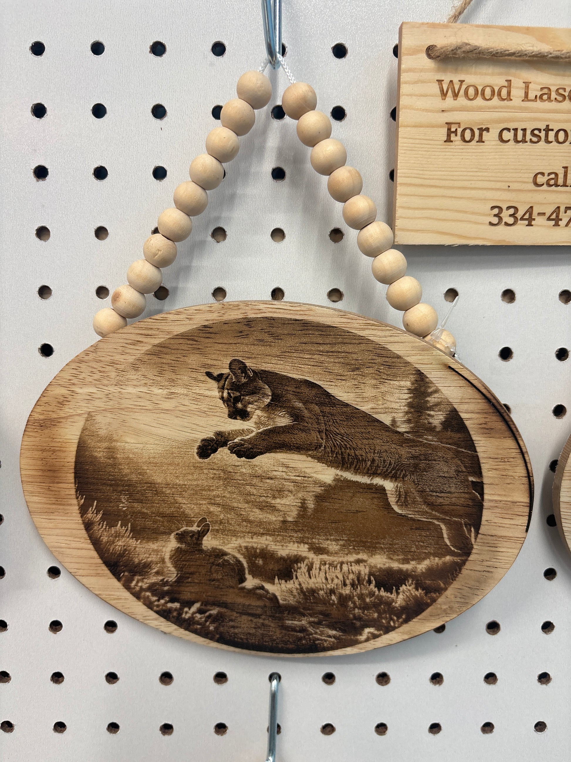 The BO8 is a precision-crafted wooden sign featuring a laser-engraved cougar design. This product exemplifies durability and aesthetic appeal, making it suitable for both indoor and outdoor settings. Its intricate engraving enhances the natural beauty of the wood, providing an attractive and lasting decorative element for various environments.
