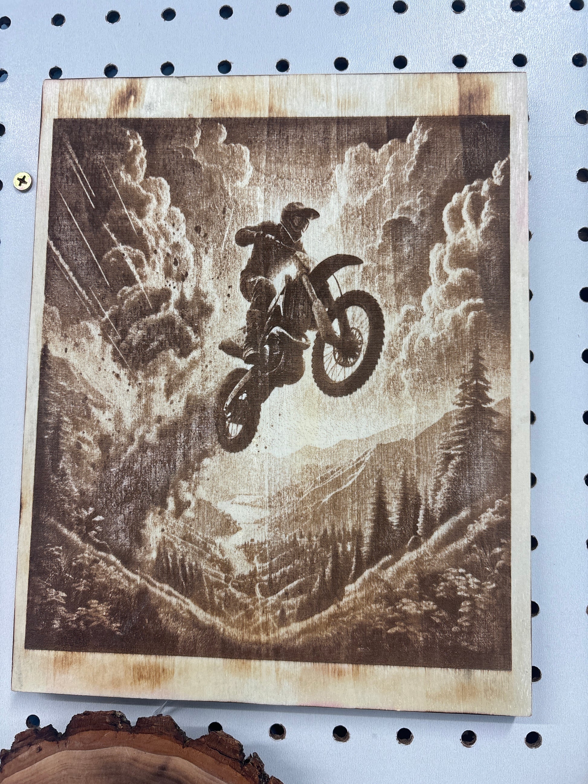 The PF1 is a precision-crafted wood piece featuring a laser-engraved design of a dirt bike. This technique ensures high detail and durability, enhancing the visual appeal while preserving the wood's integrity. Ideal for collectors and enthusiasts, it offers a unique decorative element that celebrates motorsport culture through art.