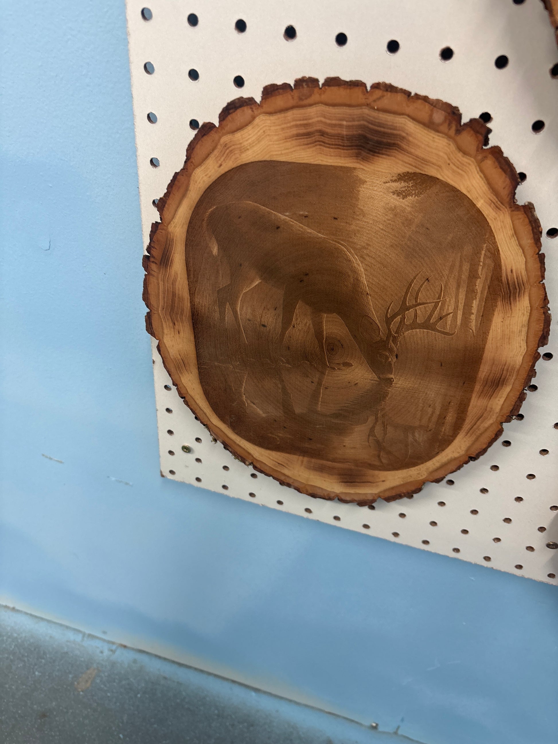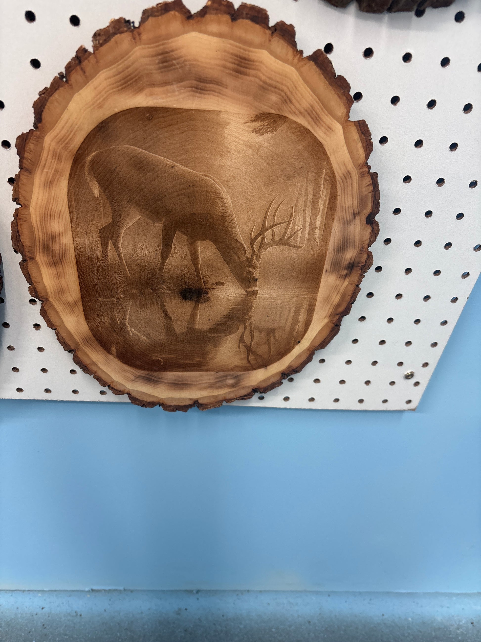 The TS10 features precision laser engraving on wood, depicting a detailed deer design. This technique ensures durability, with designs that resist fading over time. The natural wood material adds an organic aesthetic, making it suitable for both decorative and functional purposes in various environments.