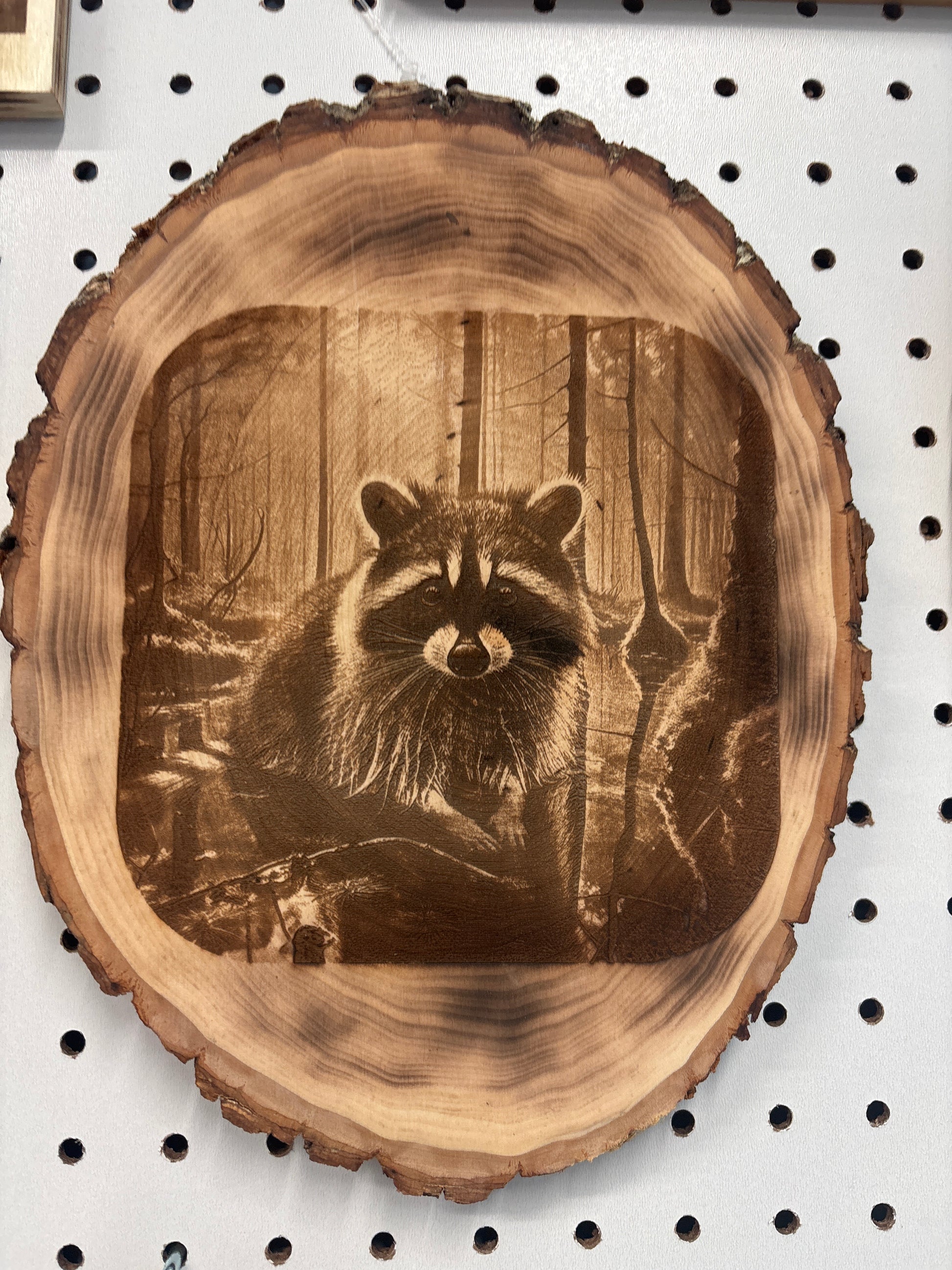 The TS2 features a precisely laser-engraved wood depiction of a raccoon, showcasing intricate details that enhance its aesthetic appeal. This method ensures durability and longevity, making it a suitable decorative piece for various environments. The natural wood finish complements diverse design styles while offering a unique, artisanal quality.