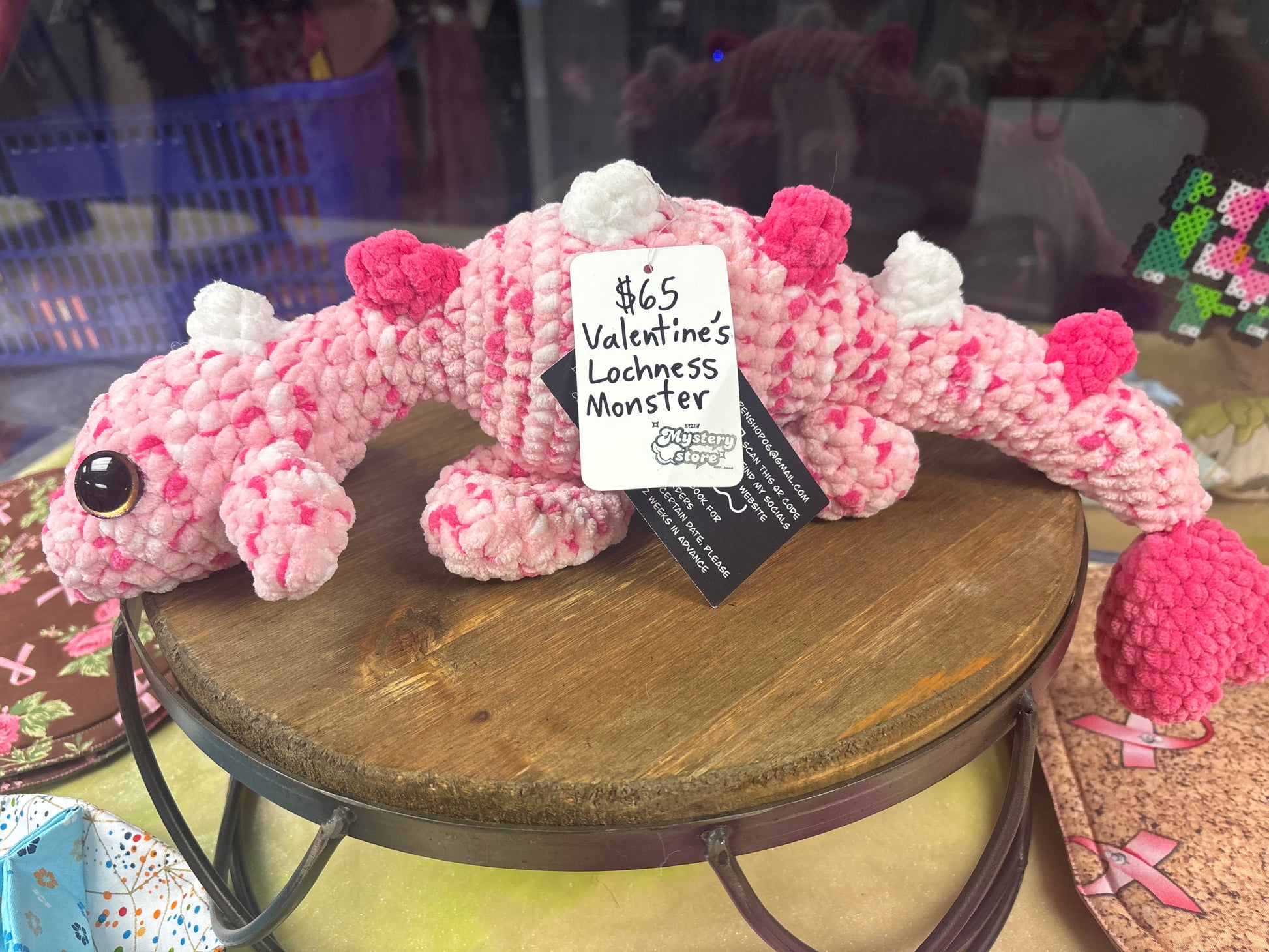 The Valentines Lochness is a handmade crochet plushy, meticulously crafted for durability and aesthetic appeal. Its unique design combines artistic expression with tactile comfort, making it suitable for gifting or as a decorative item. The use of high-quality yarn ensures a soft, lasting texture that enhances its charm.